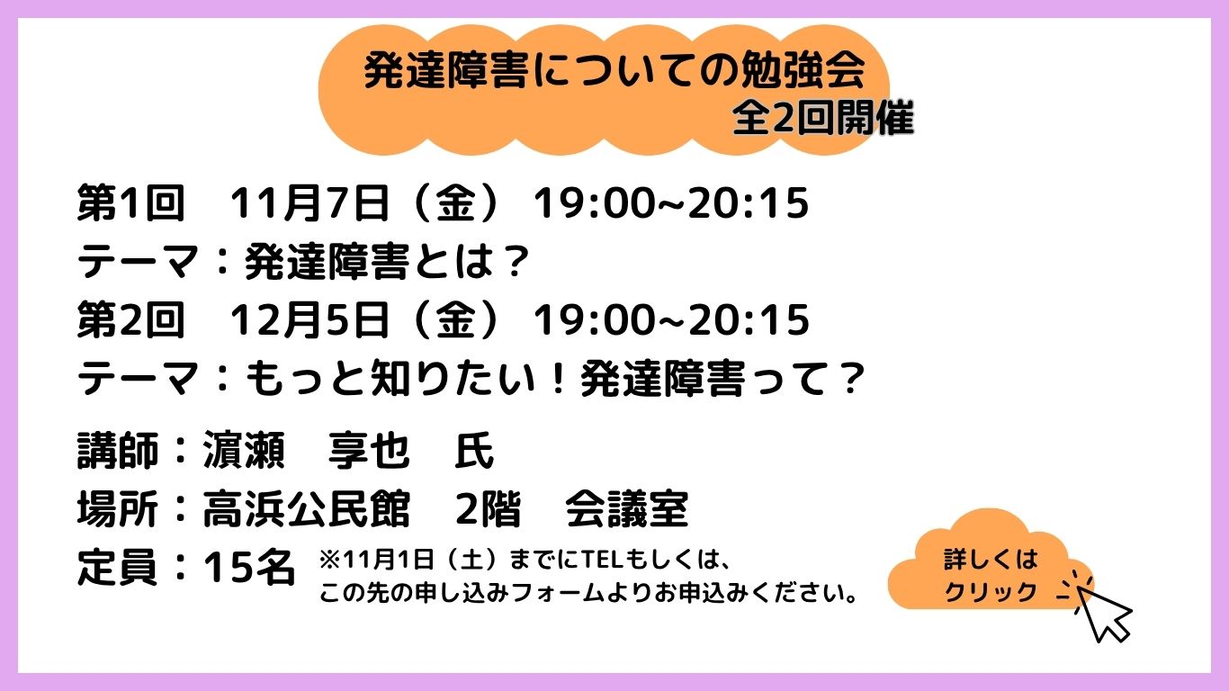 12月5日(金)19:00~20:15(第2階) 高浜公民館2階会議室にて、濵瀬 享也氏を講師としてお呼びし、発達障害についての勉強会を開催致します。